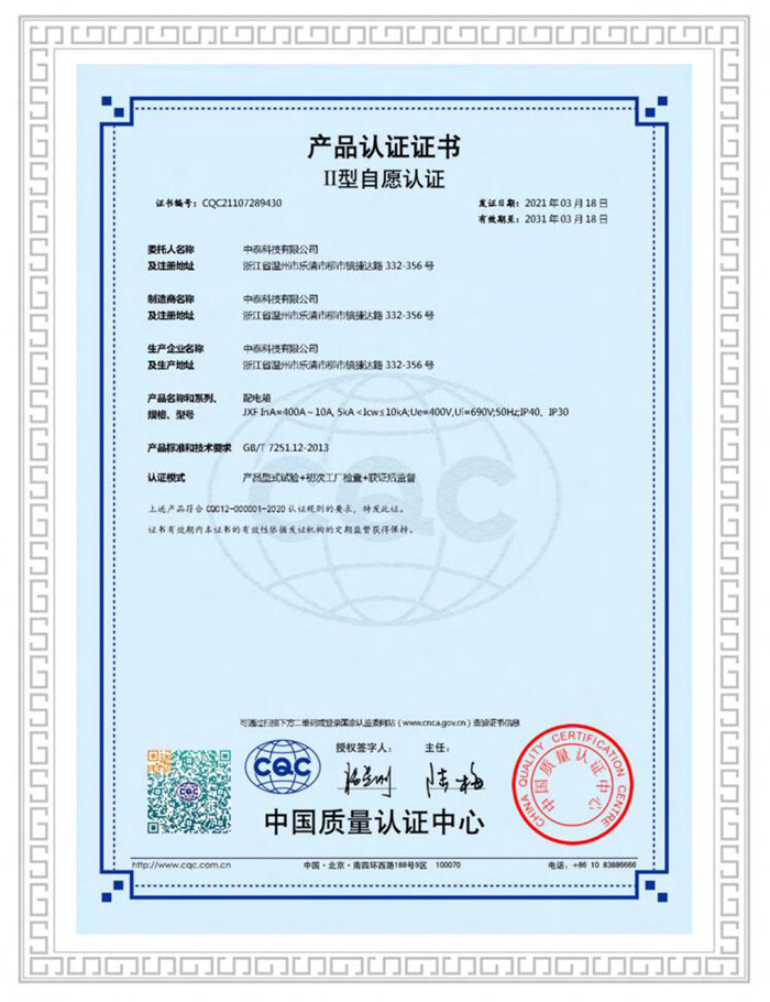 **質量認證產品認證證書